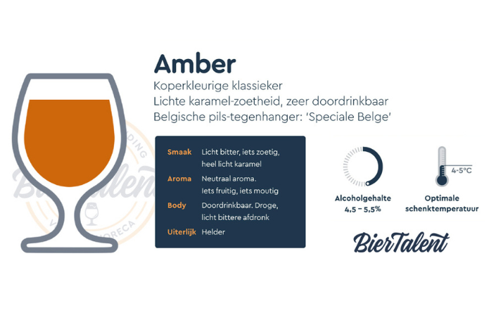 De bitterheid van dit bier is laag en de zoetheid van dit bier is ook laag tot medium. Amberbier heeft een alcoholpercentage van ongeveer 4,5 – 5,5%. En heeft daarom een optimale schenktemperatuur tussen de 4-5°C.