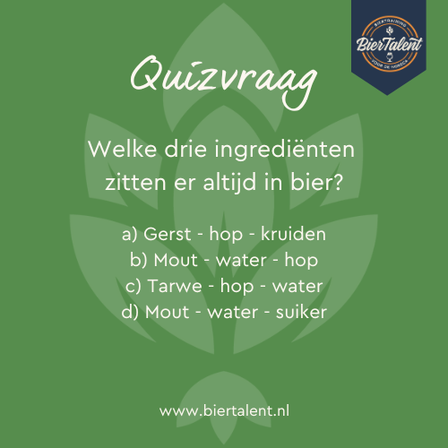 Alle ingrediënten die worden genoemd in de antwoorden kunnen worden gebruikt in bier. Echter komen enkel mout, water en hop áltijd in bier. Mout kan gemaakt worden van diverse soorten graan (zoals gerst en tarwe). Mout vormt samen met water de basis van ieder bier. Hop is in Nederland bij wet verplicht om mee te brouwen. In het ene biertype heeft hop een grote invloed op de smaak en aroma’s, bij andere biertypes nauwelijks. Hop wordt echter altijd gebruikt tijdens het brouwen. Antwoord B is het goede antwoord!